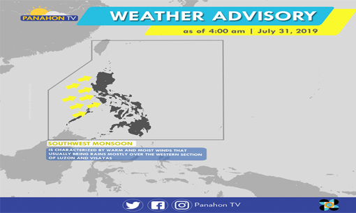At 3:00 a.m., a Tropical Depression was spotted 760 km West of Northern Luzon (OUTSIDE PAR). According to PAGASA, although it has a slim chance of entering the Philippine Area of Responsibility, it will enhance the Southwest Monsoon that is currently affecting the western section of Luzon. It will bring cloudy skies with isolated rain showers and thunderstorms over Pangasinan, Zambales, and Bataan. Cloudy skies with isolated rain showers and thunderstorms is also expected over Eastern Visayas, Caraga, and Davao Region due to the Trough of Low Pressure Area spotted East of the country. Meanwhile, Metro Manila and the rest of the country will experience partly cloudy to cloudy skies with isolated rain showers or thunderstorms.