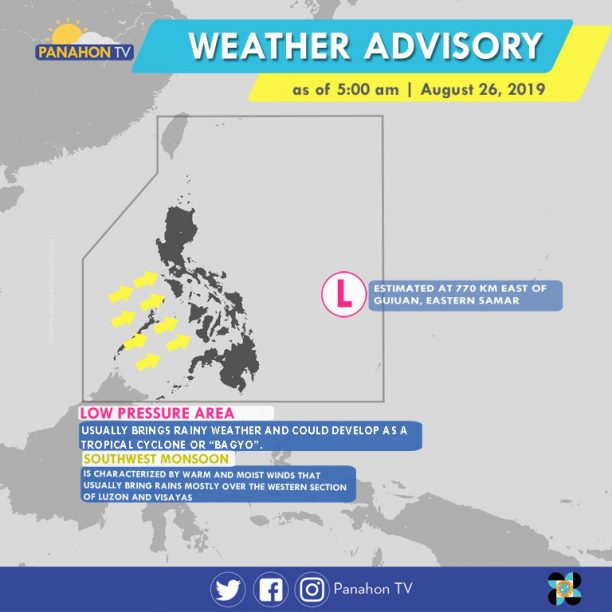 The Low Pressure Area (LPA) was spotted at 770 km East of Guiuan, Eastern Samar. Southwest Monsoon affecting Southern Luzon and Visayas. MIMAROPA, Bicol Region, Northern Mindanao and Zamboanga Peninsula will experience cloudy skies with scattered rainshowers and thunderstorms. Meanwhile, partly cloudy to cloudy skies with isolated rainshowers is expected over Metro Manila and the rest of the country.