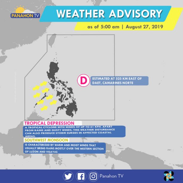 The Tropical Depression “JENNY” was spotted at 525 km East of Daet, Camarines Norte with maximum sustained winds of 55 kph near the center and gustiness of up to 70 kph. It is moving West at 25 kph. Southwest Monsoon affecting western sections of Southern Luzon and Visayas. Metro Manila, Ilocos Region, Cordillera Administrative Region, Cagayan Valley, Central Luzon, CALABARZON, Camarines provinces and Catanduanes will experience Rains with gusty winds. Cloud skies with scattered rainshowers and thunderstorms is expected over Zamboanga Peninsula, BARMM, Northern Mindanao, Caraga, Visayas and the rest of Luzon. Meanwhile, The rest of Mindanao will have partly cloudy to cloudy skies with isolated rainshowers.