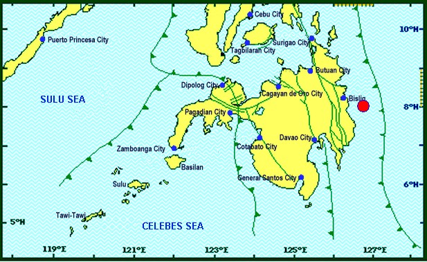 Location: 08.03°N, 126.77°E – 039 km S 89° E of Lingig (Surigao Del Sur)